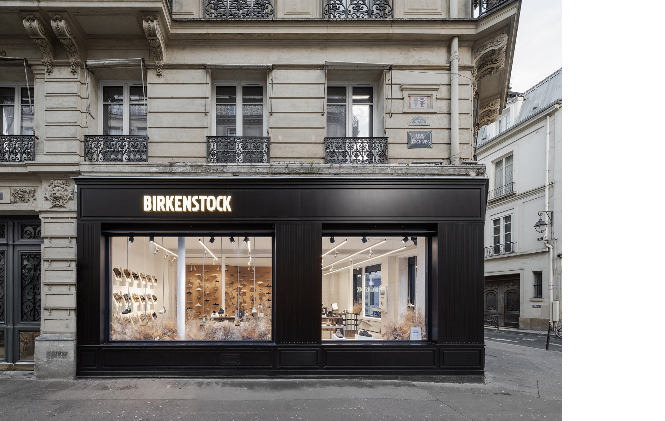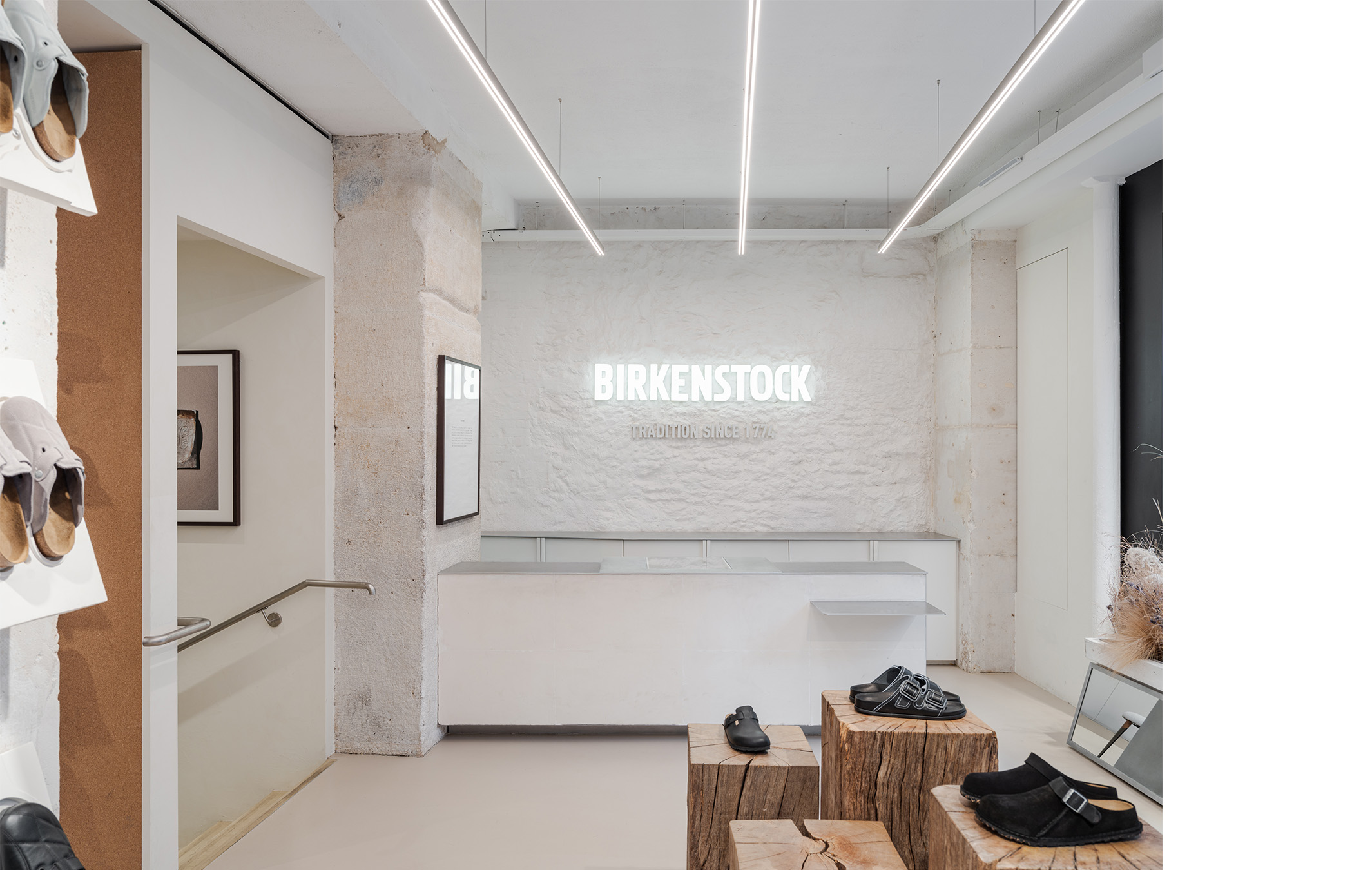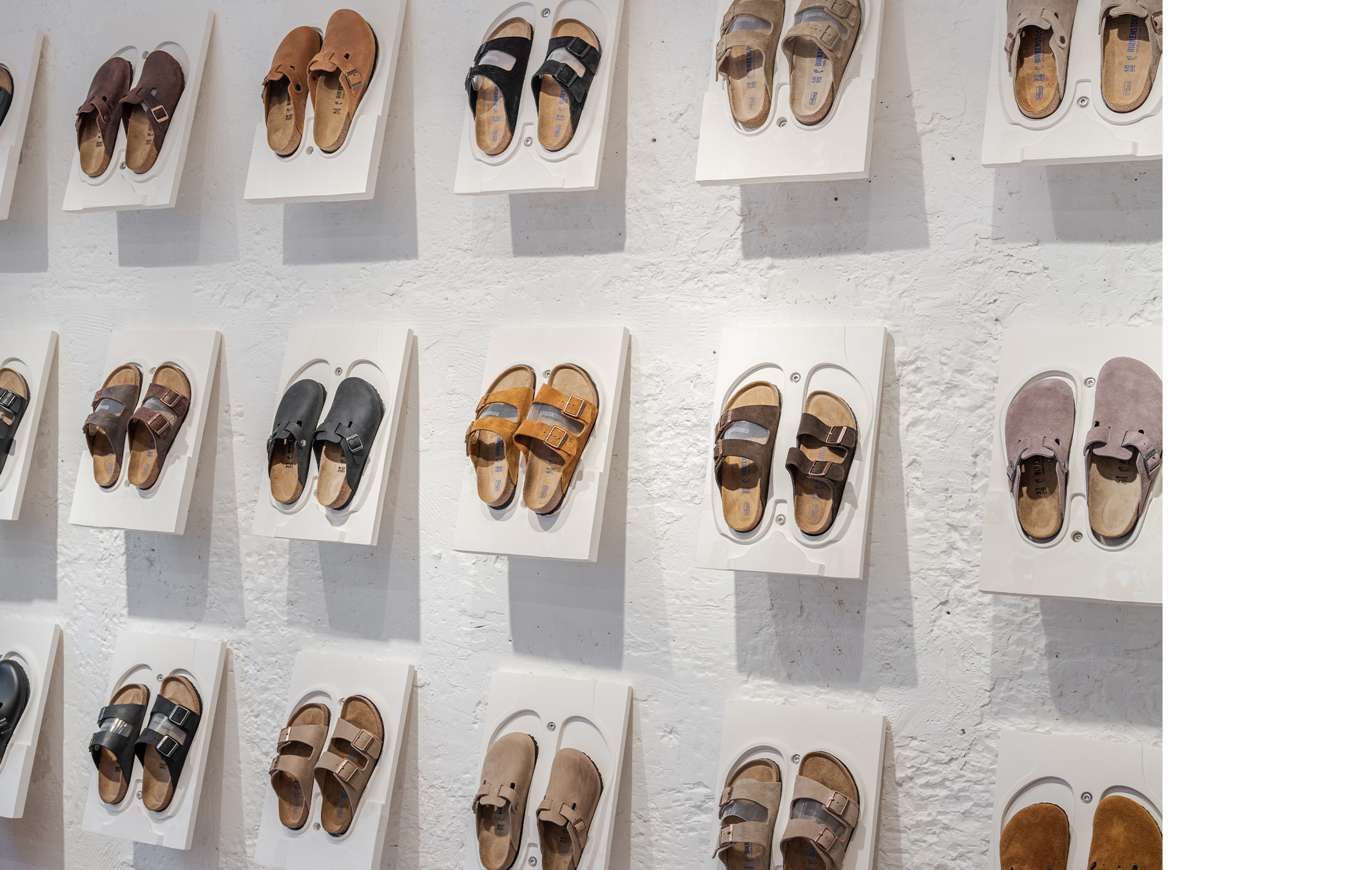 La boutique Birkenstock du Marais, à Paris, illustre une tension fondamentale qui nous inspire constamment : l’équilibre entre production industrielle et savoir-faire artisanal.