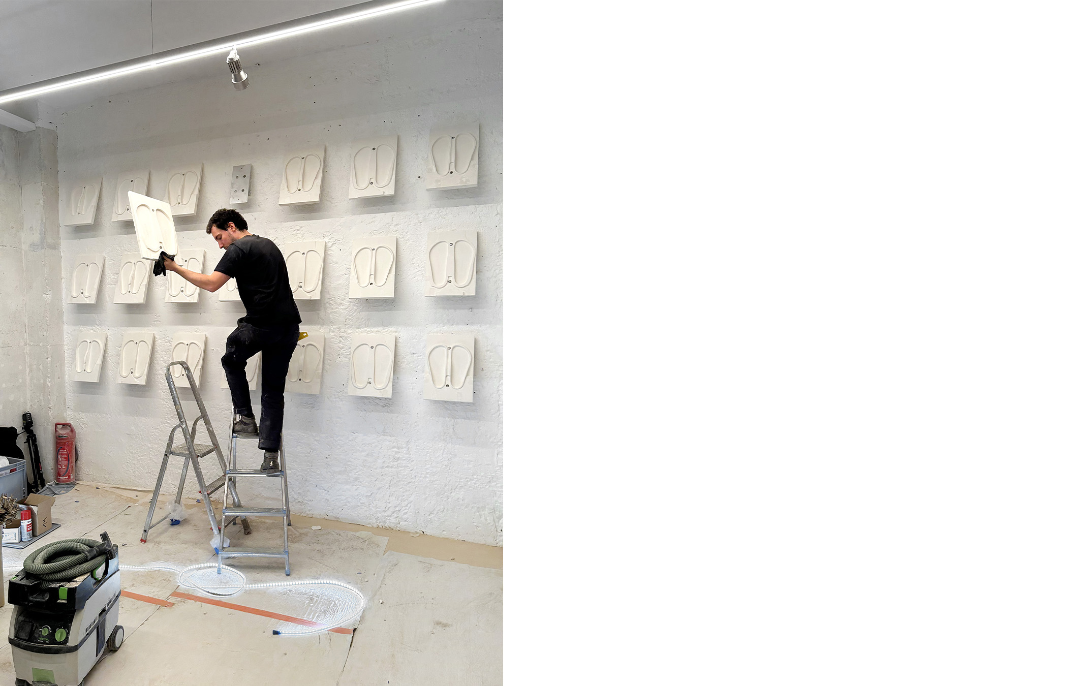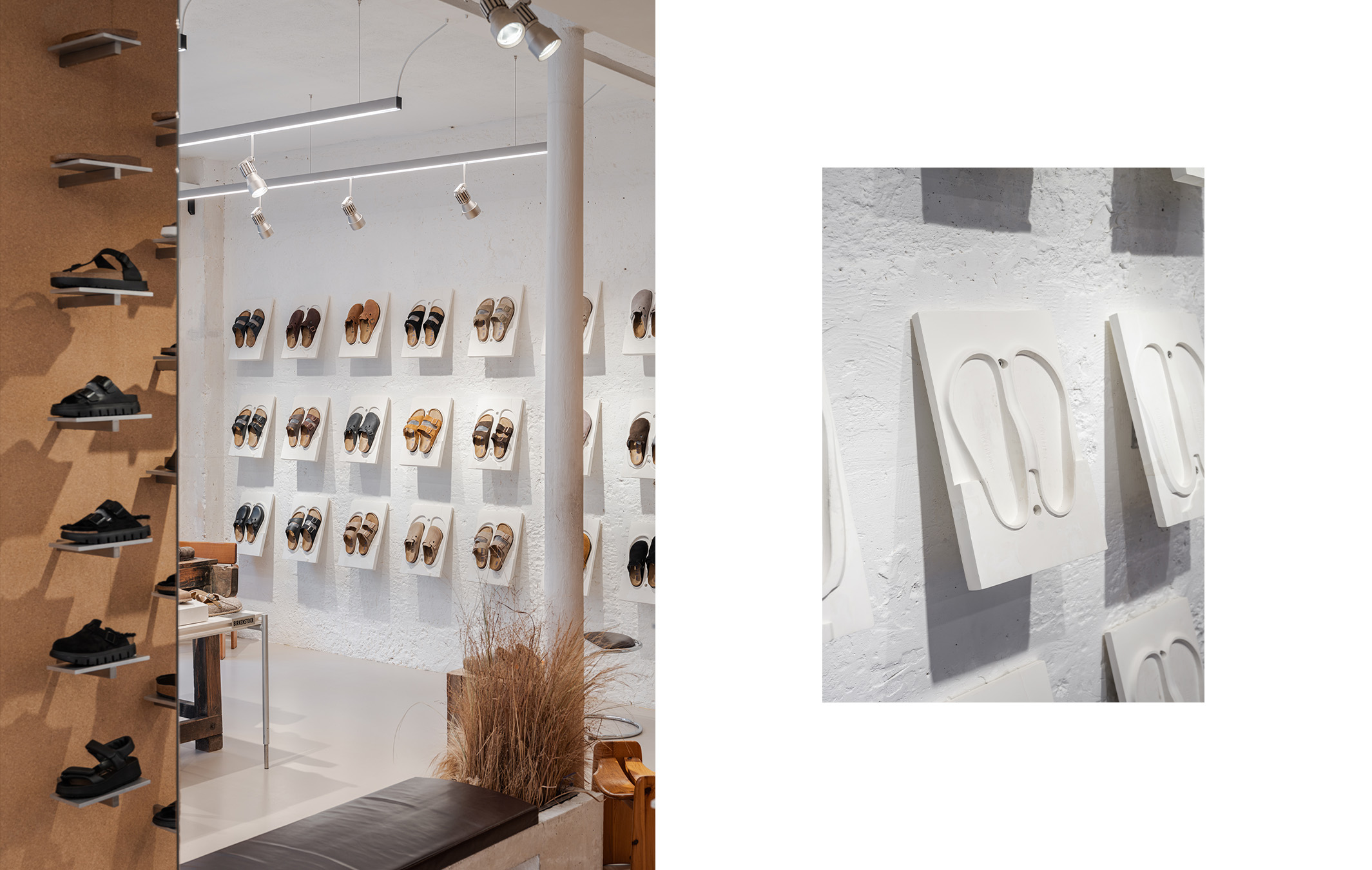 Située à l’angle des rues des Archives et Sainte-Croix, la boutique bénéficie de larges vitrines en L qui baignent ses murs blanchis à la chaux d’une lumière naturelle. En collaboration avec Côme Clérino du Studio Çocle, nous avons imaginé des modules d’exposition en plâtre réinterprétant les célèbres moules de semelles Birkenstock, transformant ces outils de production en étagères sur mesure parfaitement intégrées aux murs. Un fil d’aluminium souligne les miroirs, le comptoir et les présentoirs muraux, rappelant l’usage intensif de ce matériau dans le processus de fabrication de la marque, que ce soit pour le mobilier, les équipements ou les installations.