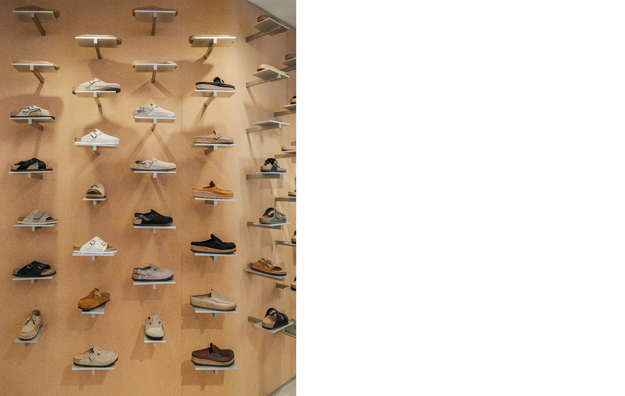 Lors de notre première visite à l’atelier Birkenstock, nous avons été fascinés par le dialogue entre la main et la machine : un processus de production à grande échelle, pourtant guidé avec une précision minutieuse par l’expertise humaine. Une autre dualité caractéristique de la marque réside dans ses créations, à la fois strictement utilitaires et résolument élégantes. Nous avons voulu refléter ces correspondances à travers un espace à la fois fonctionnel et poétique.